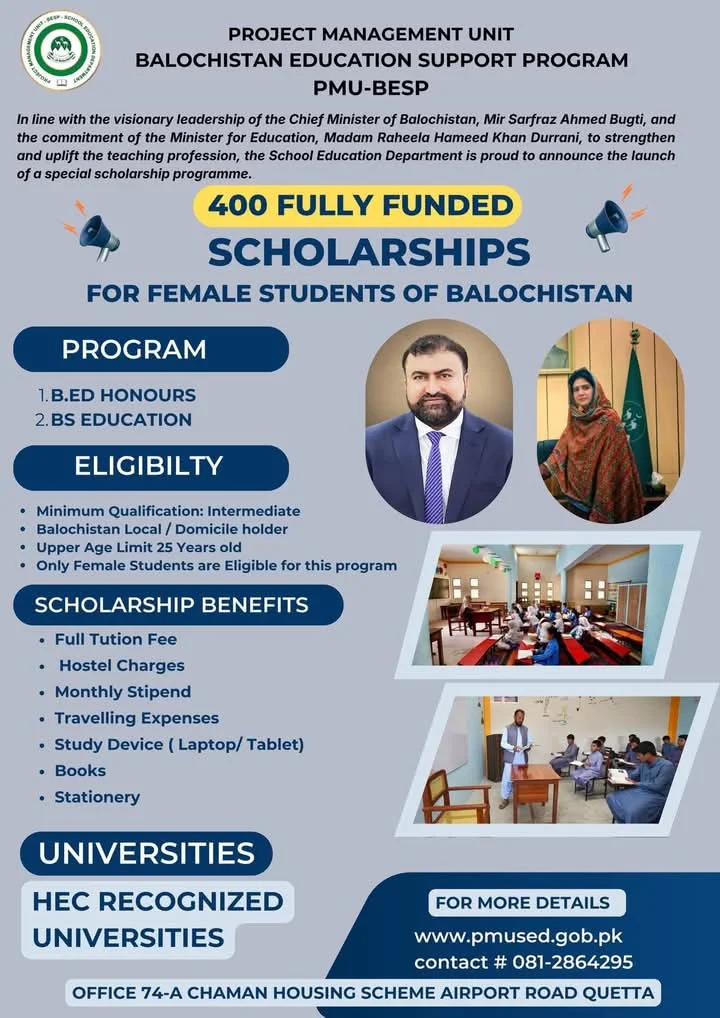 The Project Management Unit (PMU) – Balochistan Education Support Program (BESP), under the School Education Department, has launched a special scholarship program offering 400 fully funded scholarships dedicated exclusively to female students of Balochistan. This initiative aligns with the vision of the Chief Minister of Balochistan, Mir Sarfraz Ahmed Bugti, and the commitment of the Minister for Education, Madam Raheeela Hameed Khan Durrani, to strengthen and uplift the teaching profession.
