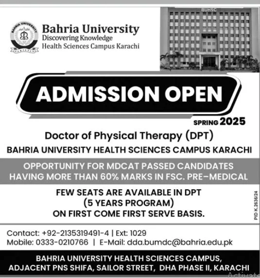 Bahria University’s Health Sciences Campus in Karachi is now accepting applications for its 5-year Doctor of Physical Therapy (DPT) program for Spring 2025. Limited seats are available on a first-come, first-served basis.