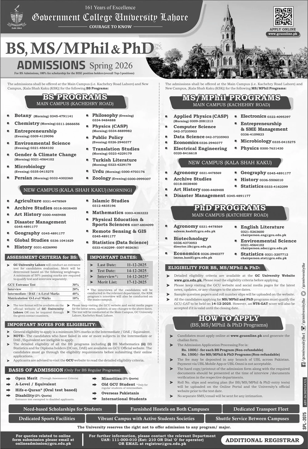 Eligibility: Detailed eligibility criteria for each program (BS, MS/MPhil, & PhD) are available on the GCU website. Generally, for BS admissions, applicants must meet specific Intermediate/DAE/Equivalent requirements.