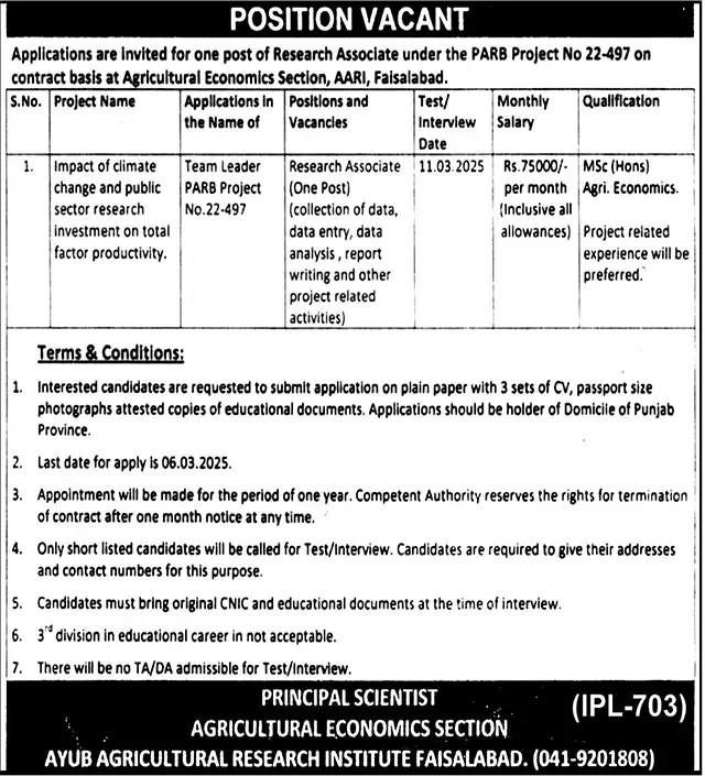 A position for Research Associate is available under the PARB Project No. 22-497 at the Agricultural Economics Section, AARI, Faisalabad. The selected candidate will be responsible for data collection, data entry, data analysis, report writing, and other project-related activities. The job is a contract-based position for a period of one year, with a monthly salary of Rs. 75,000 (inclusive of all allowances). Candidates with an MSc (Hons) in Agricultural Economics and relevant project-related experience will be preferred.