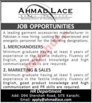 Ahmad Lace Works LTD Karachi job Vacancies & Positions