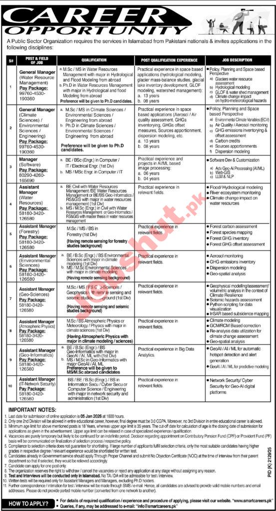 A prestigious Public Sector Organization (SUPARCO) based in Islamabad has announced multiple high-level career opportunities for Pakistani nationals. This recruitment drive focuses on specialized fields such as Water Resource Management, Climate Sciences, Software Development, Forestry, and Geo-Sciences.