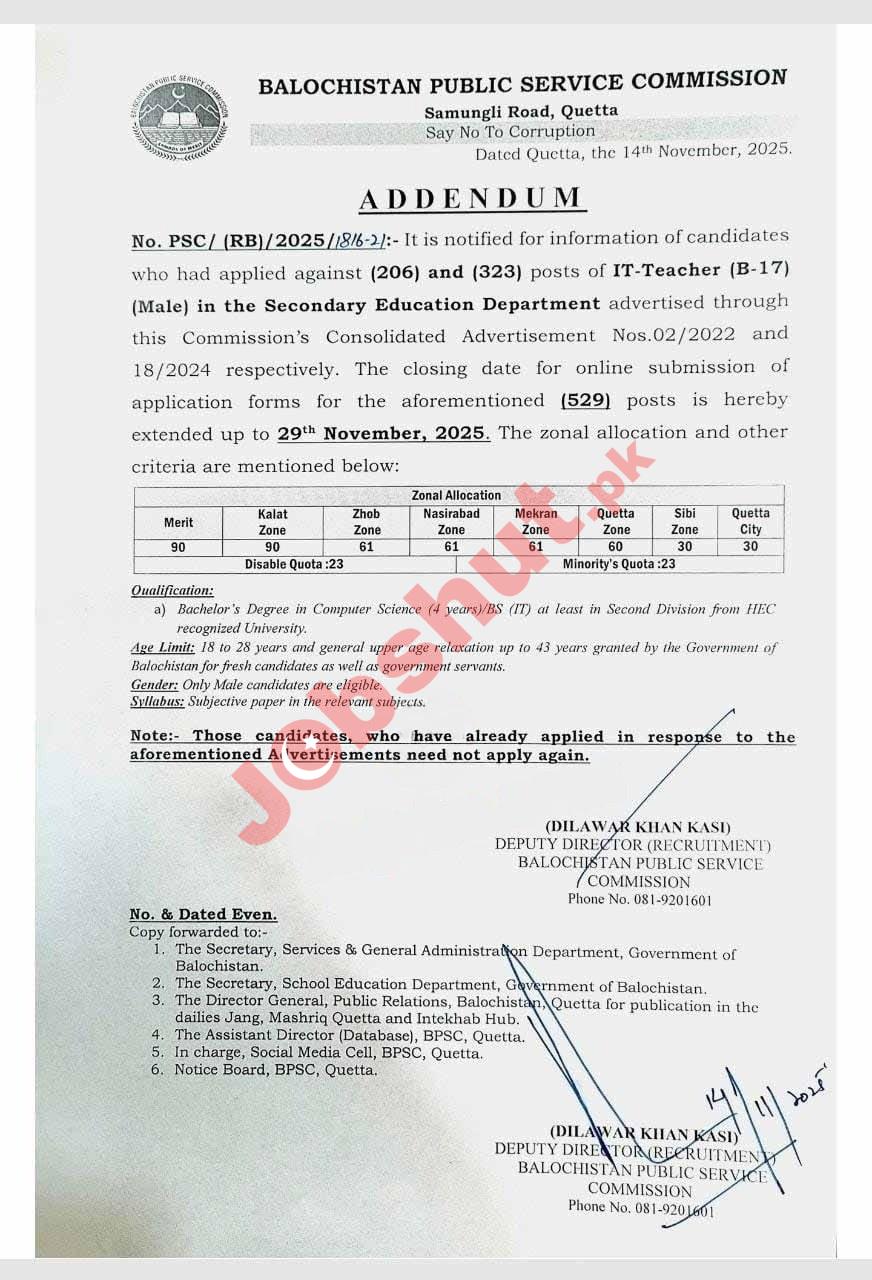 The Balochistan Public Service Commission (BPSC) has issued an important addendum regarding the recruitment of IT-Teacher (B-17) (Male) for the Secondary Education Department. This notice is for candidates who applied against previous advertisements (Nos. 02/2022 and 18/2024) and for new applicants.