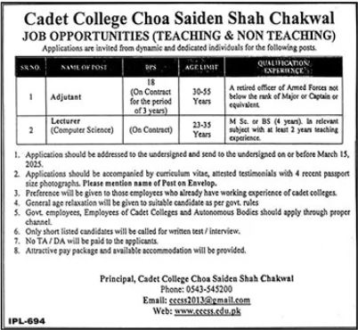 Cadet College Choa Saiden Shah Chakwal is seeking dynamic and dedicated individuals for teaching and non-teaching positions. This advertisement focuses on two key roles: Adjutant and Lecturer (Computer Science). Both positions are on contract. The Adjutant role requires a retired officer from the Armed Forces (Major or Captain equivalent), while the Lecturer position requires a Master’s degree or BS (4 years) in Computer Science with at least two years of teaching experience. The college emphasizes a competitive pay package and accommodation for successful candidates. Preference will be given to those with prior experience in cadet colleges.