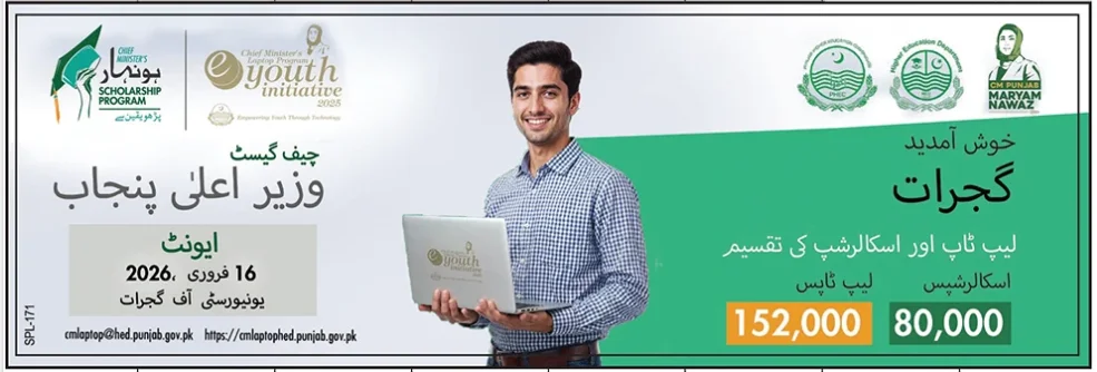 GUJRAT (February 16, 2026): In a major boost to the province’s educational landscape, Chief Minister Punjab Maryam Nawaz Sharif officially inaugurated the distribution of free laptops and “Honhaar Scholarships” at the University of Gujrat (UOG) today.