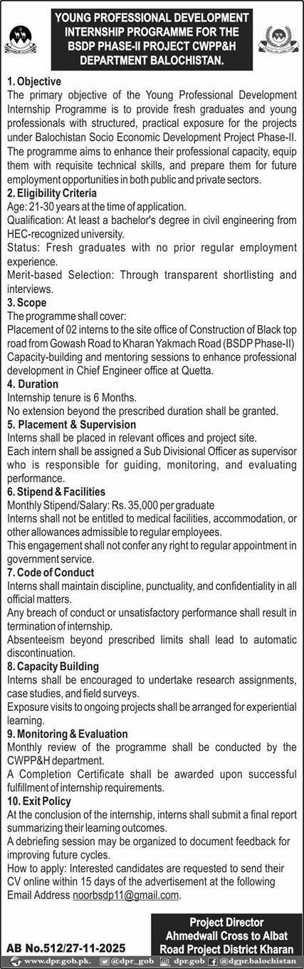 This is a six-month internship designed to provide fresh graduates and young professionals with a structured, practical exposure to projects under the Balochistan Socio-Economic Development Project Phase-II. The primary goal is to enhance the participants’ professional capacity, equip them with requisite technical skills, and prepare them for future employment opportunities in both public and private sectors.