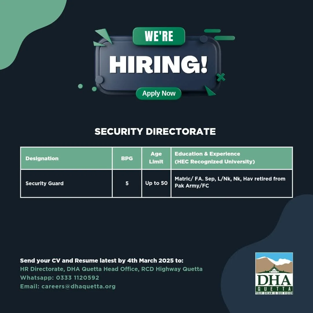 The job advertisement is for the position of Security Guard within the Security Directorate of DHA Quetta. DHA Quetta, or Defence Housing Authority Quetta, is seeking to hire individuals for this role. The position is open to candidates who meet the specified educational and experience requirements, including having a background in the Pakistani Army or Frontier Corps (FC), or possessing qualifications such as Matric, FA, Sep, L/Nk, Nk, and having retired from the Pak Army/FC.