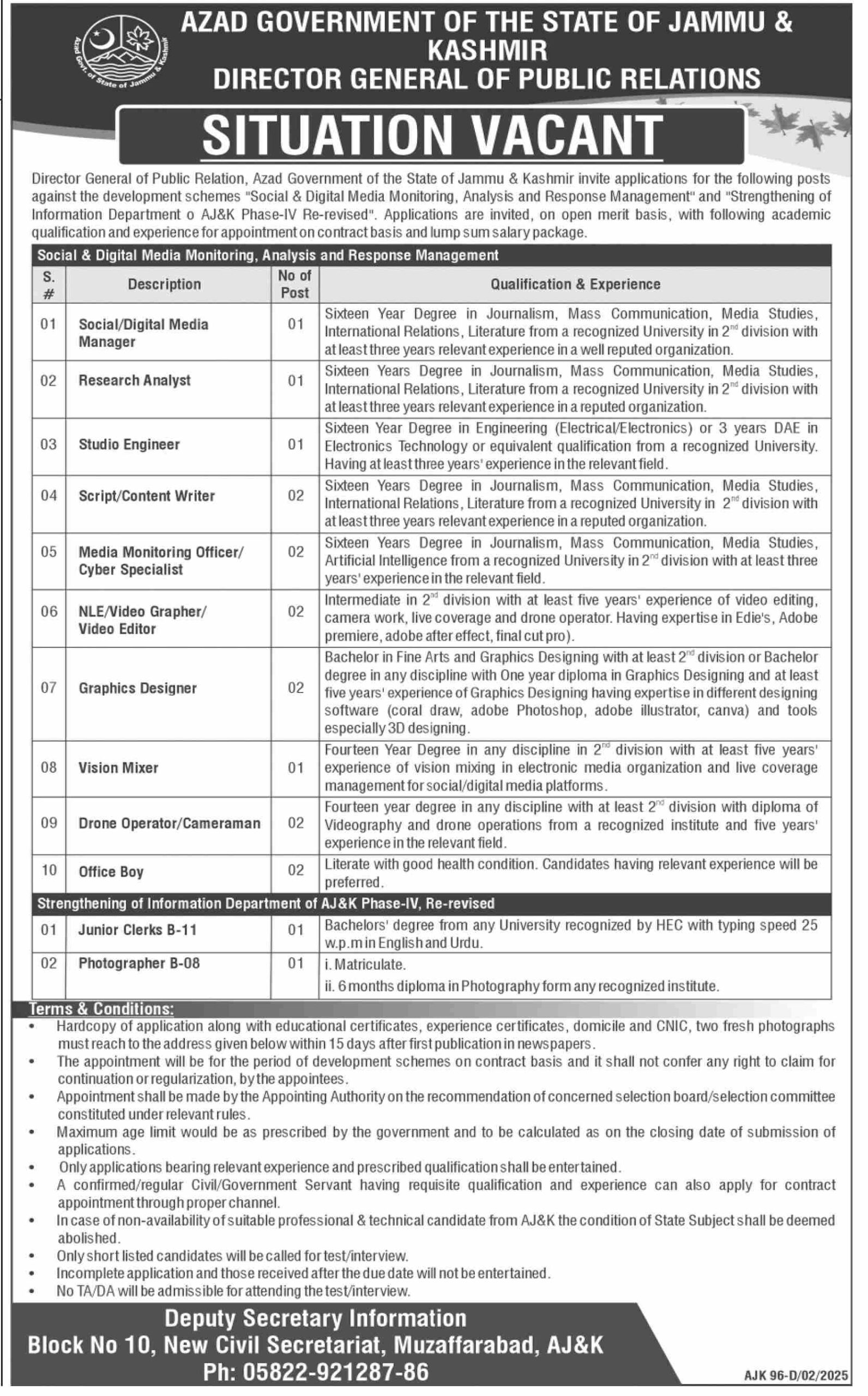 The Azad Government of the State of Jammu & Kashmir, Directorate General of Public Relations, has announced multiple job vacancies for qualified individuals. The positions are related to Social & Digital Media Monitoring, Analysis, and Response Management, as well as the Strengthening of the Information Department of AJK Phase-IV, Re-revised.