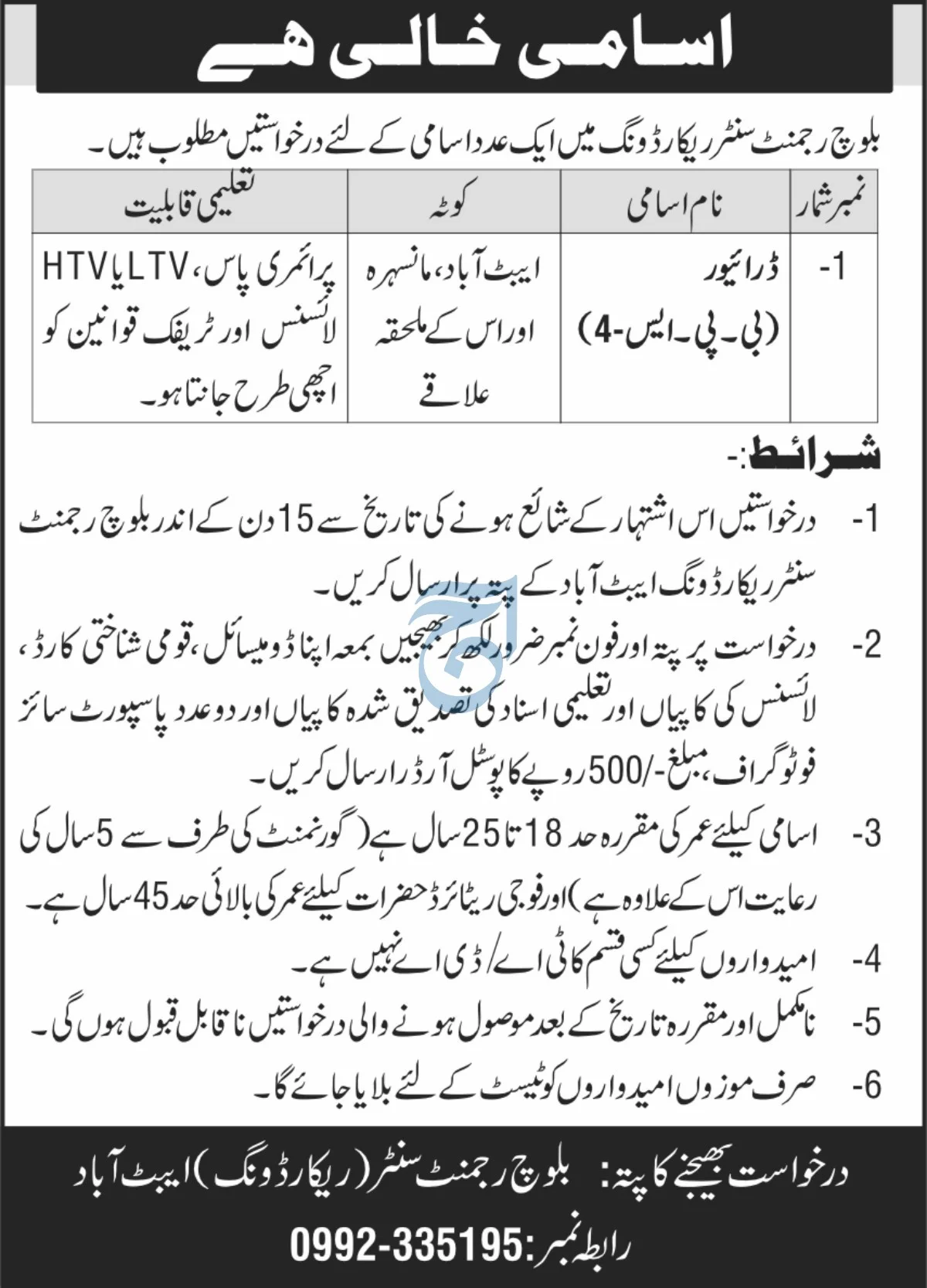 Driver jobs in Baloch Regiment Center Recording Abbottabad 2025 - Apply Now The