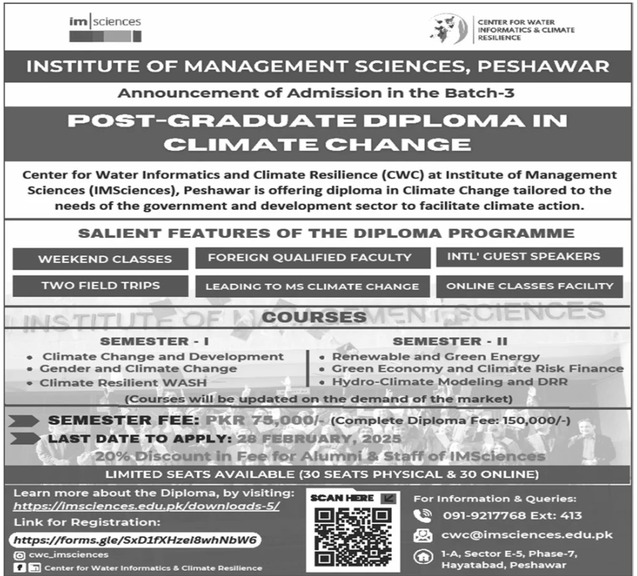 The Institute of Management Sciences (IMSciences), Peshawar, through its Center for Water Informatics & Climate Resilience (CWCR), is offering admissions for the Post-Graduate Diploma in Climate Change (Batch-3). This program is designed for professionals in the government and development sectors to enhance climate action capabilities. Key features include weekend classes, foreign-qualified faculty, international guest speakers, field trips, and pathways to an MS in Climate Change. The curriculum covers topics like renewable energy, climate risk finance, and hydro-climate modeling. Limited seats are available for both physical and online modes.