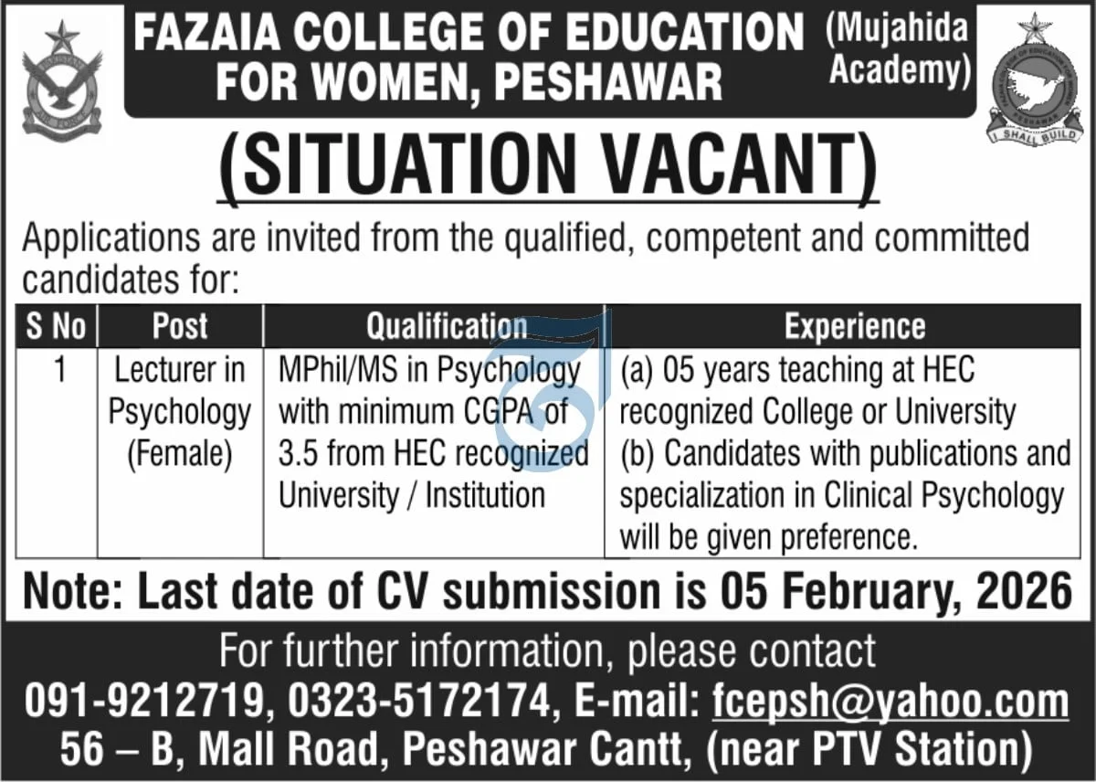 Fazaia College of Education for Women (Mujahida Academy), Peshawar, is seeking applications from qualified, competent, and committed female candidates for the position of Lecturer in Psychology. This is a specialized teaching role aimed at enhancing the academic faculty of the institution.