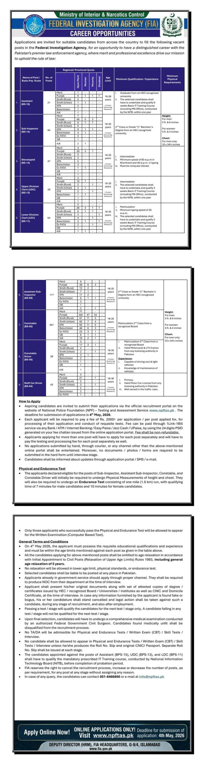 Applications are invited for suitable candidates from across the country to fill vacant posts in the Federal Investigation Agency (FIA), under the Ministry of Interior & Narcotics Control. This is an opportunity to have a distinguished career with Pakistan’s premier law enforcement agency, where merit and professional excellence drive the mission to uphold the rule of law.