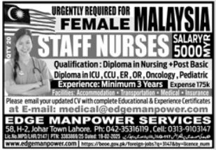 This job advertisement is for female Staff Nurses to work in Malaysia. The ideal candidate should have a Diploma in Nursing, along with a Post Basic Diploma in specialized areas such as ICU, CCU, ER, OR, Oncology, or Pediatrics. A minimum of 3 years of experience is required. The company, Edge Manpower Services, offers facilities including accommodation, transportation, and medical insurance. Interested candidates are requested to email their updated CV with complete educational and experience certificates to medical@edgemanpower.com.