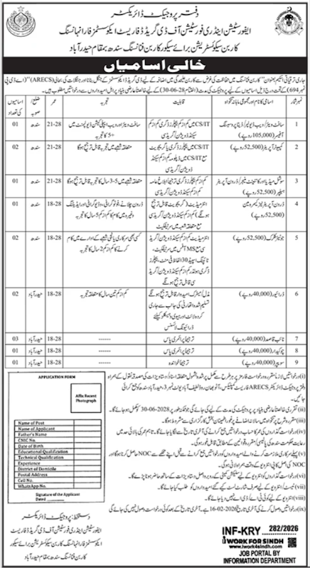 The Office of the Project Director for Afforestation and Forestry Ecosystem Restoration (ARECS) under the Carbon Sequestration project in Sindh has announced various job opportunities. This project focuses on carbon sequestration through forestry restoration and is located in Hyderabad, Sindh.