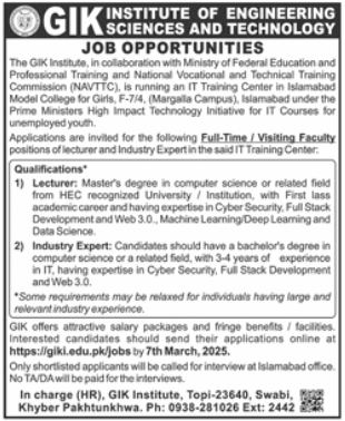 The GIK Institute, in collaboration with the Ministry of Federal Education and Professional Training and NAVTTC, is establishing an IT Training Center at Islamabad Model College for Girls, F-7/4, Islamabad. This initiative, under the Prime Minister’s High Impact Technology Initiative, aims to provide IT training to unemployed youth. They are seeking qualified Lecturers and Industry Experts to fill Full-Time and Visiting Faculty positions.