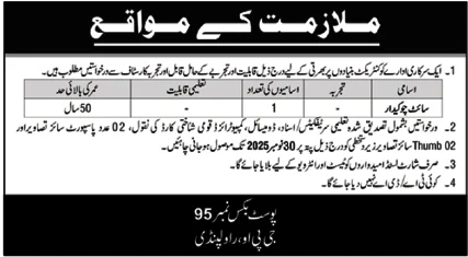 A public sector government organization in Rawalpindi has announced a vacancy for the position of Security Guard. Applications are invited from physically fit candidates holding a Middle pass qualification. Applicants must have security experience and be capable of performing duties responsibly. The selected candidate will be appointed for a contract-based position at Chungi No. 22, Rawalpindi.