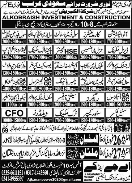 The job advertisement is for positions at Alkobraish Investment & Construction. The available roles are HSE Engineer and Mechanic Foreman Workshop. These positions are likely related to construction and maintenance, focusing on health, safety, and environmental (HSE) standards and mechanical workshop operations. The advertisement does not provide extensive details, but it is clear that the company is seeking qualified professionals for these roles.