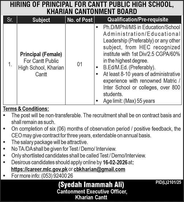 The Kharian Cantonment Board has announced a high-level career opportunity for the position of Principal (Female) for the Cantt Public High School, Kharian Cantt. This recruitment is aimed at hiring a highly qualified and experienced educational leader to manage the institution effectively.
