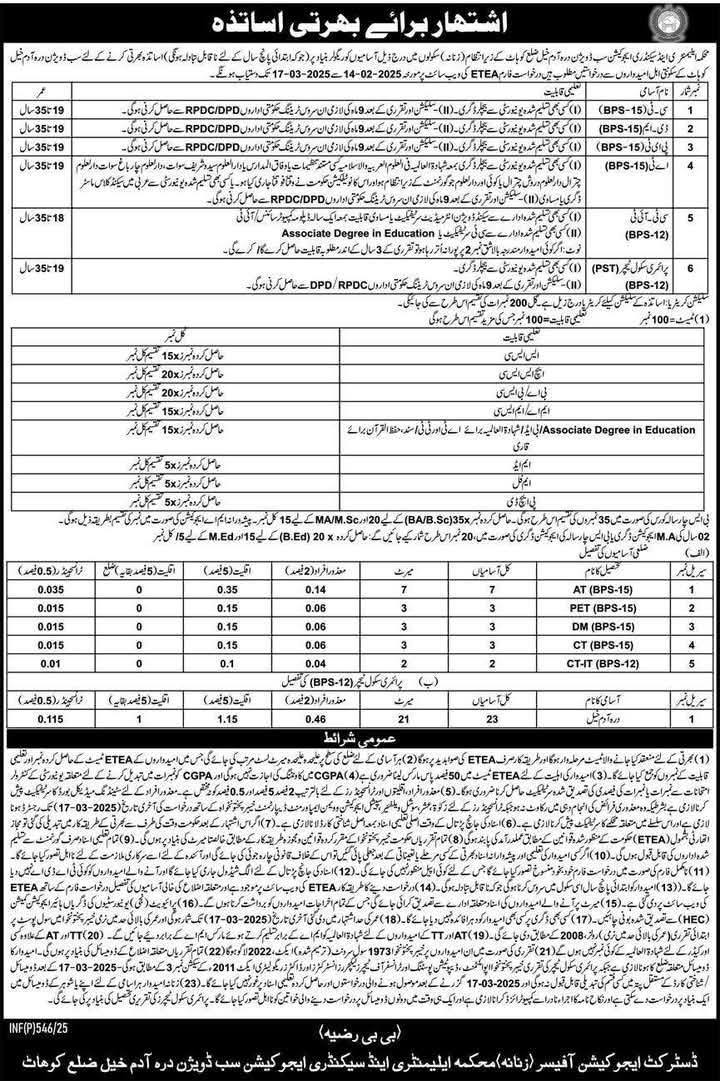 | Hiring Organization: | Elementary and Secondary Education Sub-Division, Darra Adam Khel, District Kohat |