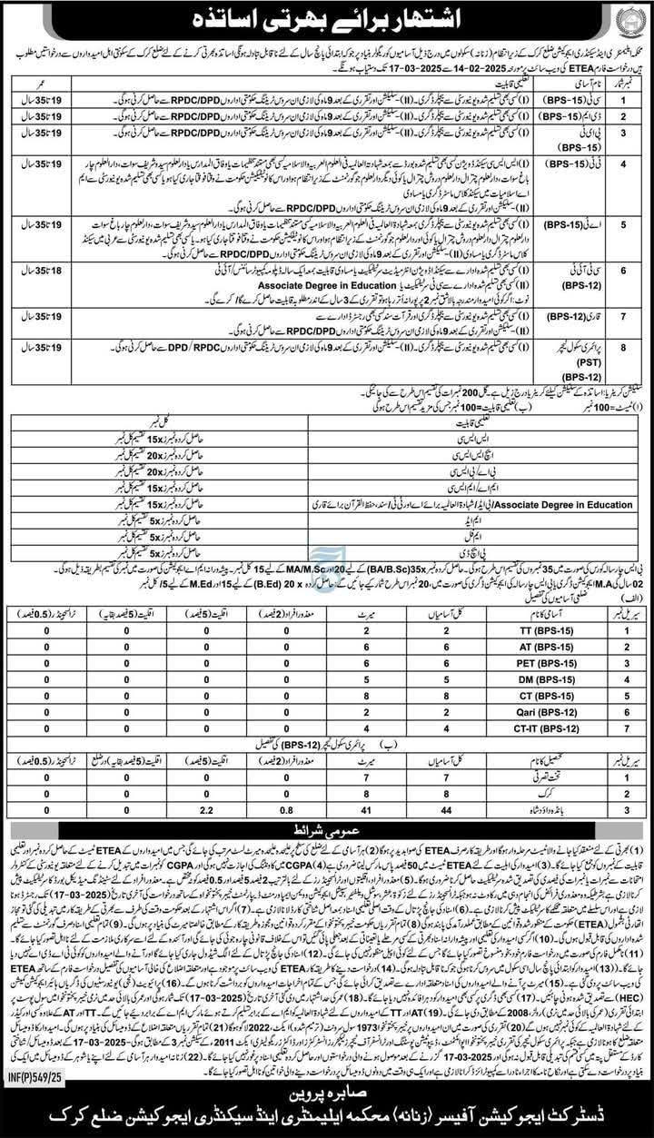 | Hiring Organization: | District Education Officer (Female), Department of Elementary and Secondary Education, Karak District |