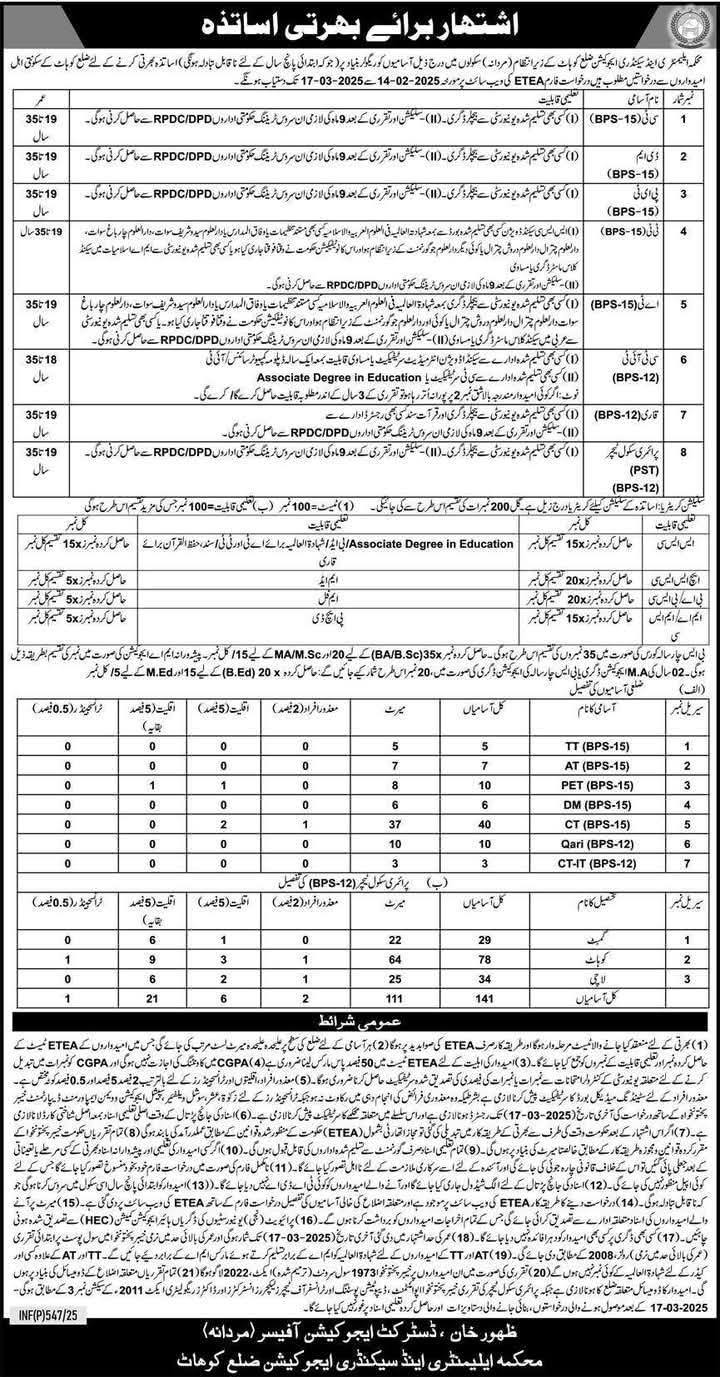 This advertisement is for the recruitment of teachers in male schools under the control of the Elementary and Secondary Education Department, District Kohat, Khyber Pakhtunkhwa, Pakistan. The positions are on a regular basis, but the initial five years are non-transferable. The district is seeking applications from eligible candidates residing in Kohat.