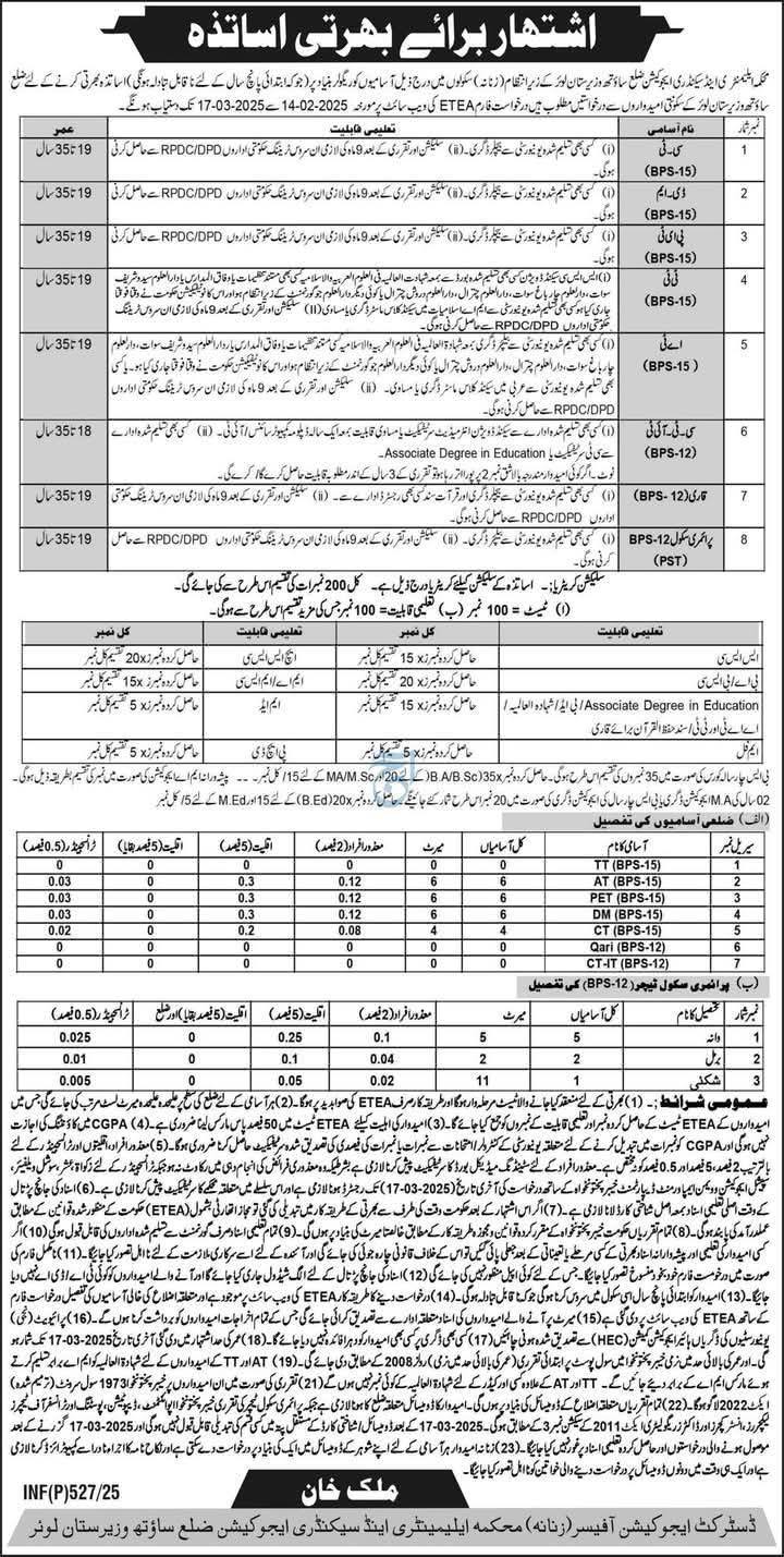 | Hiring Organization: | Elementary and Secondary Education Department, South Waziristan |