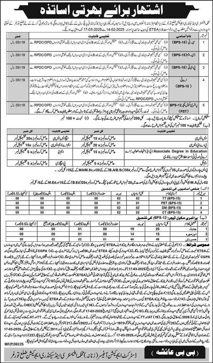 This advertisement is for the recruitment of female teachers in schools under the Elementary and Secondary Education Department of Torghar District, Khyber Pakhtunkhwa, Pakistan. The positions are on a regular basis but initially non-transferable for five years. The district is seeking applications from eligible female candidates who are residents of Torghar.
