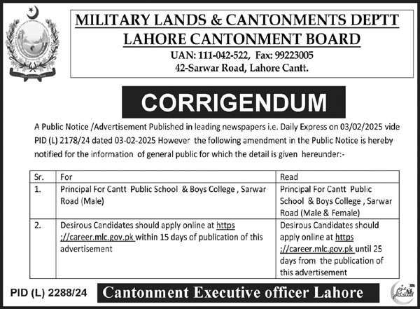 The Lahore Cantonment Board under the Military Lands and Cantonments Department is hiring a Principal for Cantt Public School & Boys College, Sarwar Road, Lahore. Applications are invited from qualified candidates via the online portal within 15 days of the advertisement’s publication. This is a government-sector teaching position in Lahore, Punjab.