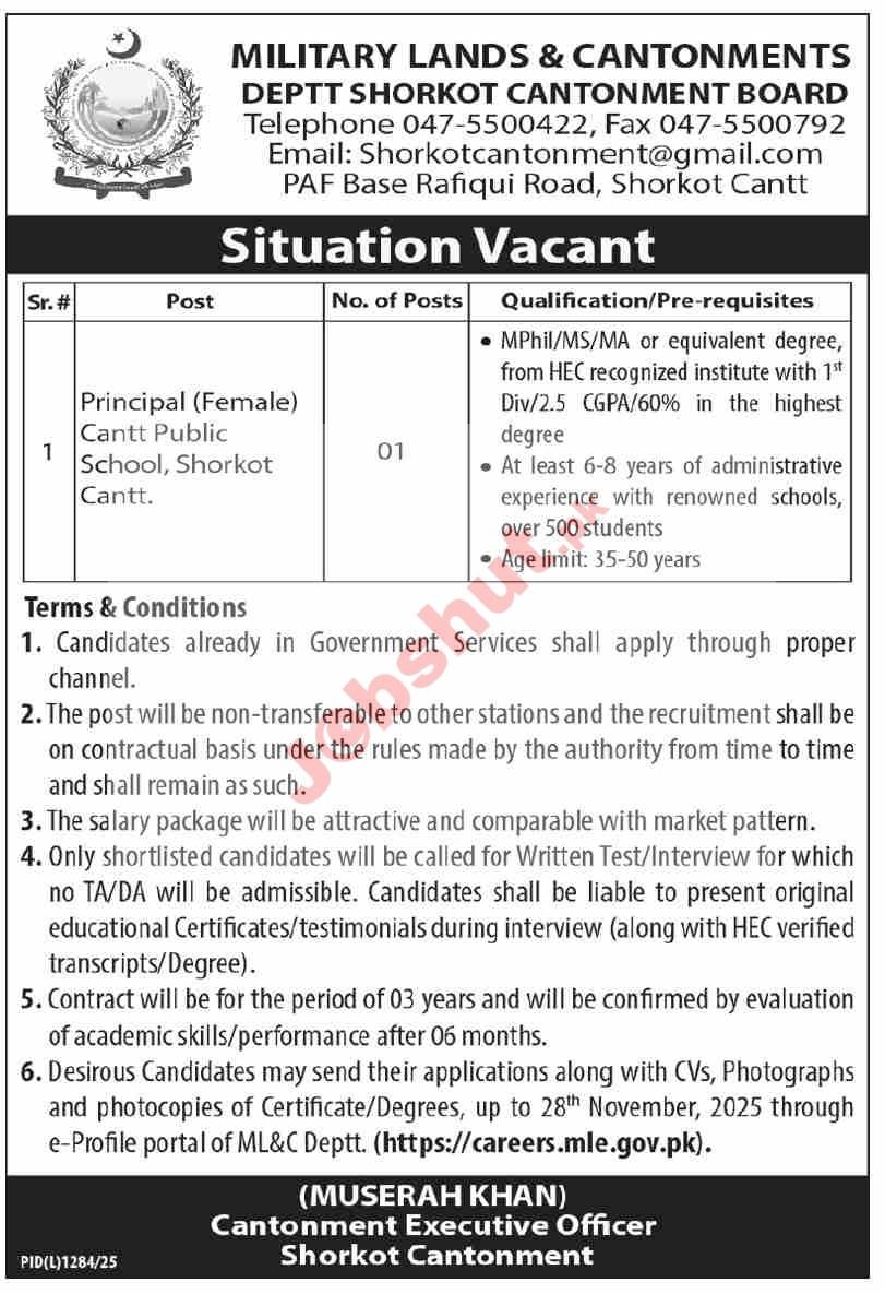 The Military Lands & Cantonments (ML&C) Department, Shorkot Cantonment Board, is seeking a highly qualified and experienced female professional for the “Situation Vacant” of Principal at the Cantt Public School, Shorkot Cantt.