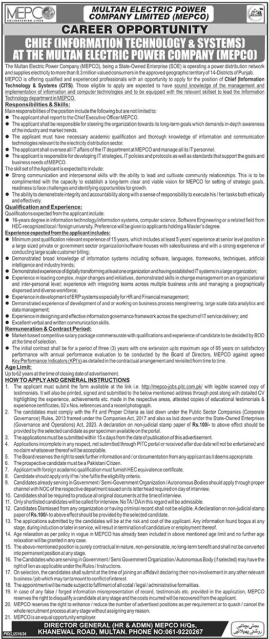The Multan Electric Power Company (MEPCO) is seeking a highly qualified and experienced professional to fill the position of Chief (Information Technology & Systems) (CITS). This is a senior-level role responsible for leading MEPCO’s IT department and driving the company’s technological strategy. The CITS will oversee all IT affairs, develop IT policies and protocols, and ensure that the IT infrastructure supports the company’s business needs. The ideal candidate will have a strong background in information technology, excellent leadership skills, and experience in managing large-scale IT projects.