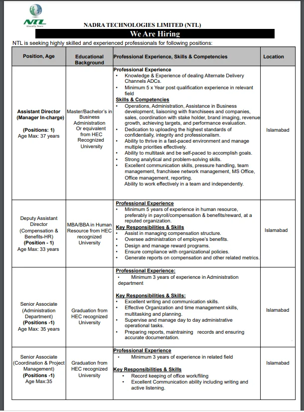 NADRA Technologies Limited (NTL) is seeking highly skilled and experienced professionals for various positions in Islamabad and Karachi. The organization is hiring for multiple roles including Assistant Director (Manager In-charge), Deputy Assistant Director (Compensation & Benefits-HR), Senior Associate, and Drivers.