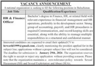 A national organization is currently seeking to fill a professional position in Balochistan. The organization is looking for a qualified individual to take on the role of HR & Finance Officer to support its operations in the region.