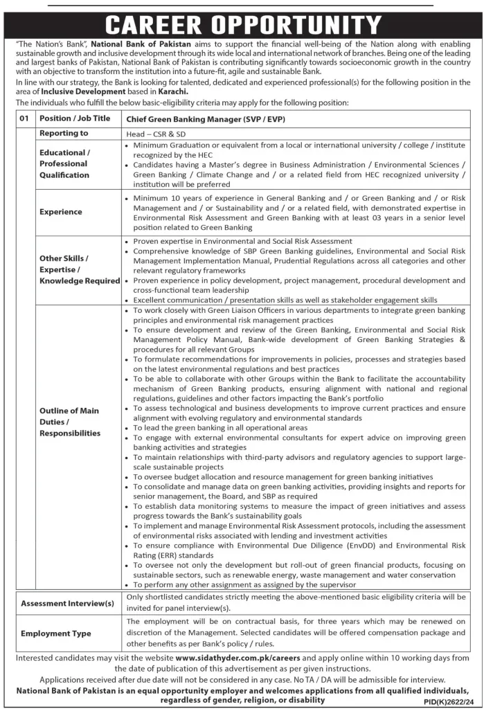 The job advertisement is for the position of Chief Green Banking Manager (SVP/EVP) at the National Bank of Pakistan, also known as “The Nation’s Bank.” This role is a senior leadership position within the bank’s Corporate Social Responsibility and Sustainable Development (CSR & SD) division, reporting to the Head of CSR & SD.