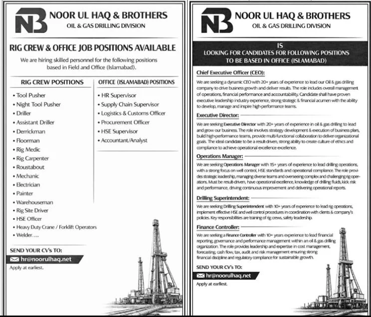 Noor Ul Haq & Brothers, a well-established company in the Oil & Gas Drilling Division, has announced multiple job opportunities for skilled, experienced, and professional candidates. The company is hiring for both Rig Crew positions and Office-based positions located in Islamabad.