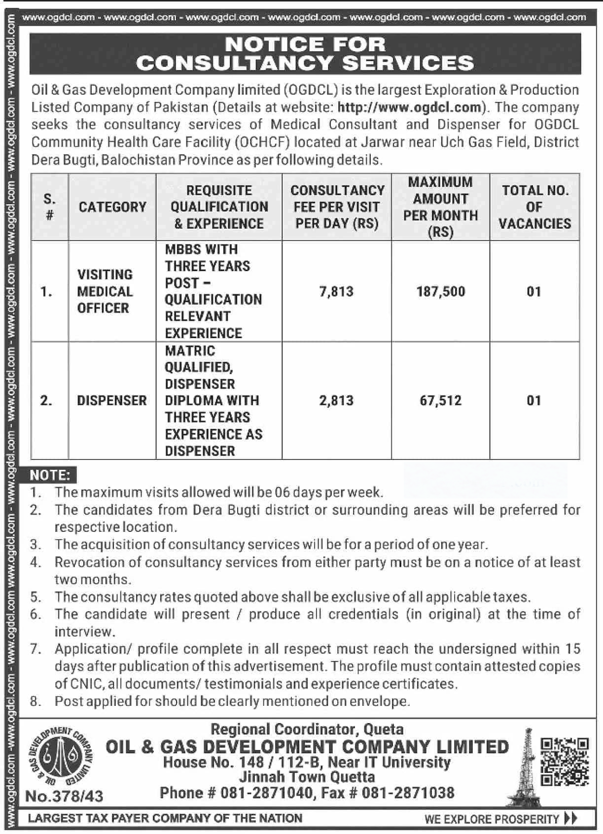 Oil & Gas Development Company Limited (OGDCL) is offering consultancy opportunities for medical professionals at its Community Health Care Facility (OCHCF) located near Uch Gas Field, District Dera Bugti, Balochistan. The company is looking for qualified candidates for the roles of Visiting Medical Officer and Dispenser. The consultancy period is one year, and selected professionals will be compensated based on daily visits.