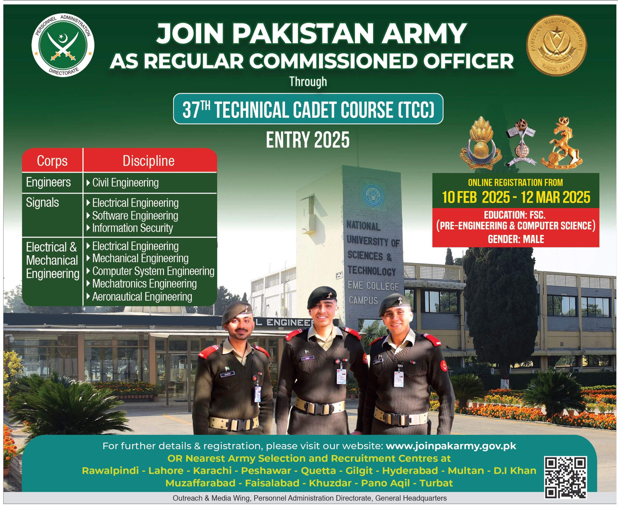 The Pakistan Army has announced recruitment for the 37th Technical Cadet Course (TCC) Entry 2025 to enlist Regular Commissioned Officers in the engineering field. The selected candidates will receive training at the National University of Sciences & Technology (NUST), EME College Campus. This opportunity is available for male candidates with FSC (Pre-Engineering & Computer Science) qualifications.