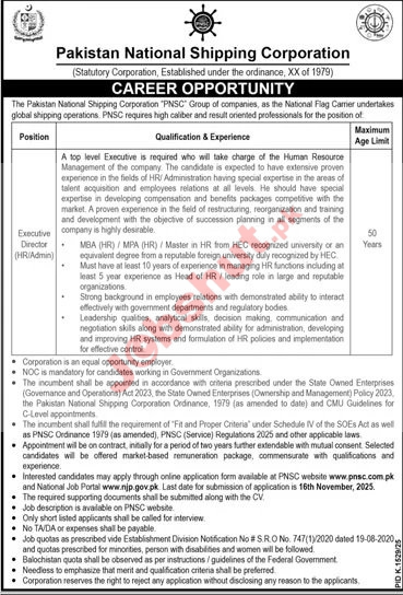 The Pakistan National Shipping Corporation (PNSC), a statutory corporation and the National Flag Carrier, is seeking applications from highly qualified and experienced professionals for the position of Executive Director (HR/Admin). This is a top-level executive role responsible for overseeing the entire Human Resource Management of the Corporation.