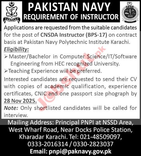 The Pakistan Navy is seeking applications from suitable candidates for a teaching position at the Pakistan Navy Polytechnic Institute (PNPI) in Karachi. The institute is hiring for the post of CNSDA Instructor (BPS-17) on a contract basis.