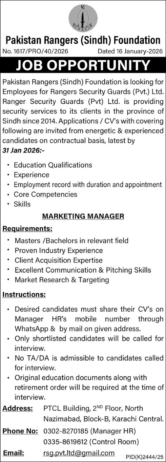 Pakistan Rangers Sindh Foundation Jobs 2026 - Apply Online For Marketing Manager Jobs