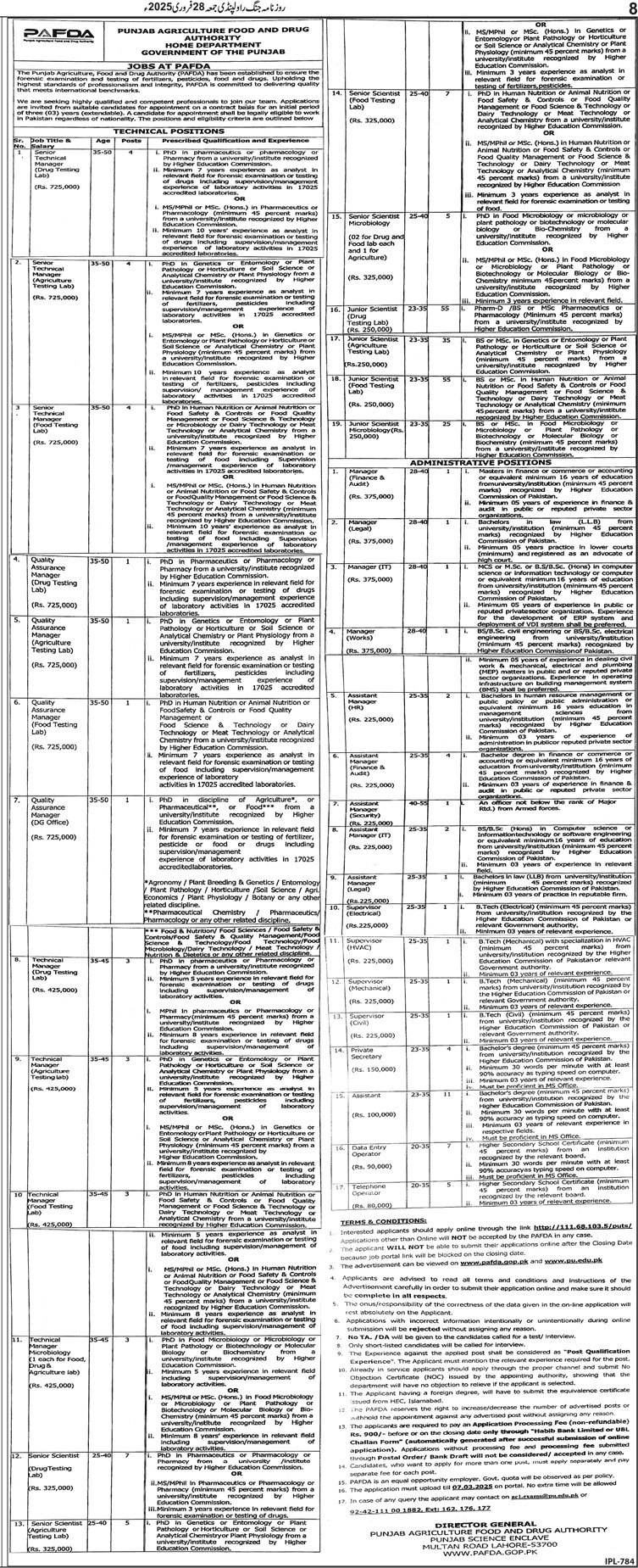 Punjab Agriculture Food and Drug Authority Jobs Advertisement Details