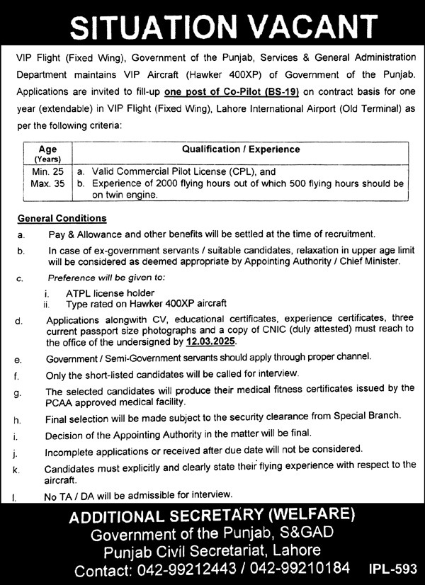 The Government of Punjab, Services & General Administration Department (S&GAD) is hiring a Co-Pilot (BS-19) on a contract basis for one year (extendable) to operate VIP Aircraft (Hawker 400XP) at Lahore International Airport (Old Terminal). The selected candidate will assist in operating fixed-wing VIP flights for government officials.