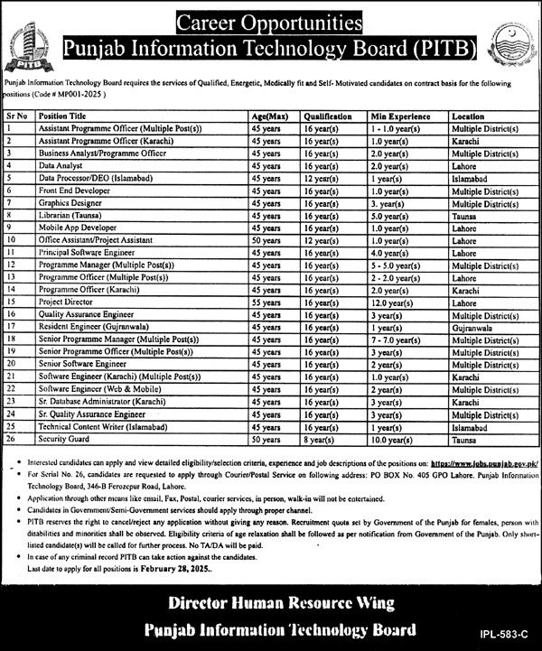 Punjab Information Technology Board (PITB) is offering multiple career opportunities for qualified, energetic, and self-motivated individuals on a contract basis. These positions are available across different cities and districts, catering to IT professionals, engineers, designers, managers, and administrative staff. The advertisement highlights the required qualifications, experience, and age limit for each post.