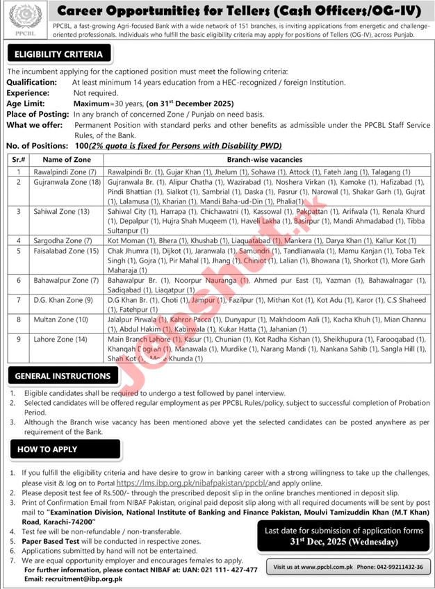 The Punjab Provincial Cooperative Bank Limited (PPCBL), a prominent Agri-focused bank with an extensive network of 151 branches, is seeking energetic and challenge-oriented professionals for the position of Tellers (Cash Officers/OG-IV). This recruitment drive offers 100 vacancies across various zones in Punjab, including Rawalpindi, Gujranwala, Sahiwal, Sargodha, Faisalabad, Bahawalpur, D.G. Khan, Multan, and Lahore.