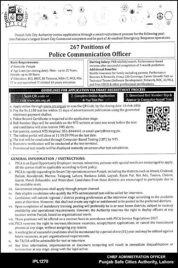 The Punjab Safe City Authority (PSCA) invites applications through a smart recruitment process for the position of Police Communication Officer. The organization is looking for individuals to join Pakistan’s largest Smart City Command ecosystem and become part of AI-enabled Emergency Response operations.