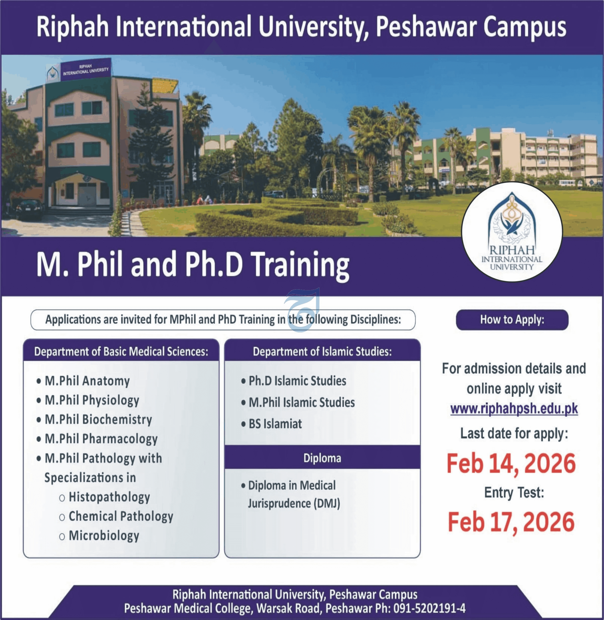 Riphah International University, Peshawar Campus, is inviting applications for M.Phil and Ph.D. Training in various disciplines for the 2026 session. The university is seeking qualified candidates to join their Department of Basic Medical Sciences and Department of Islamic Studies to pursue advanced academic research and specialized training.