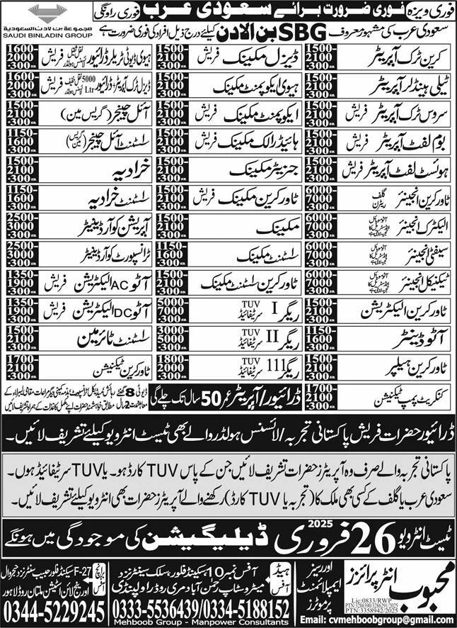 This advertisement is for urgent recruitment for various positions in Saudi Binladin Group (SBG) in Saudi Arabia. The positions range from heavy equipment operators and mechanics to engineers and coordinators. The advertisement specifies salary ranges (in Saudi Riyals) and indicates whether the positions are for freshers (new graduates) or experienced professionals.