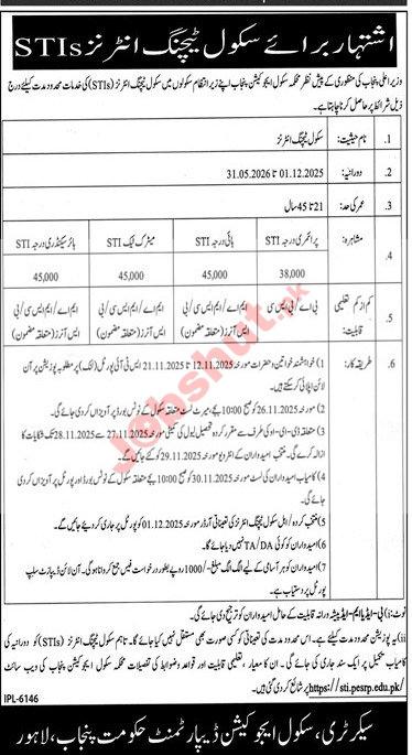 The School Education Department, Government of Punjab, has announced temporary internship opportunities for School Teaching Interns (STIs) for the 2025-26 session. This is a fixed-term contract position for selected government schools across Punjab, running from December 1, 2025, to May 31, 2026.