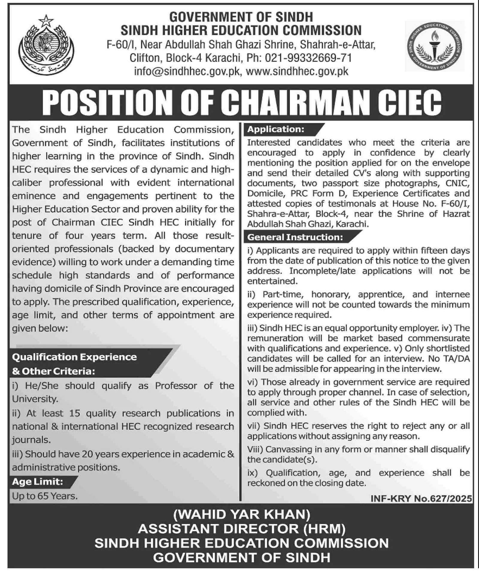 The Sindh Higher Education Commission (HEC) is seeking a highly qualified and experienced professional for the position of Chairman CIEC. The candidate should have a strong academic background, including at least 15 quality research publications in HEC-recognized journals and 20 years of experience in academic and administrative roles. The position is initially for a four-year term and requires a domicile of Sindh Province. The selected candidate will be expected to work under demanding conditions and maintain high standards of performance.