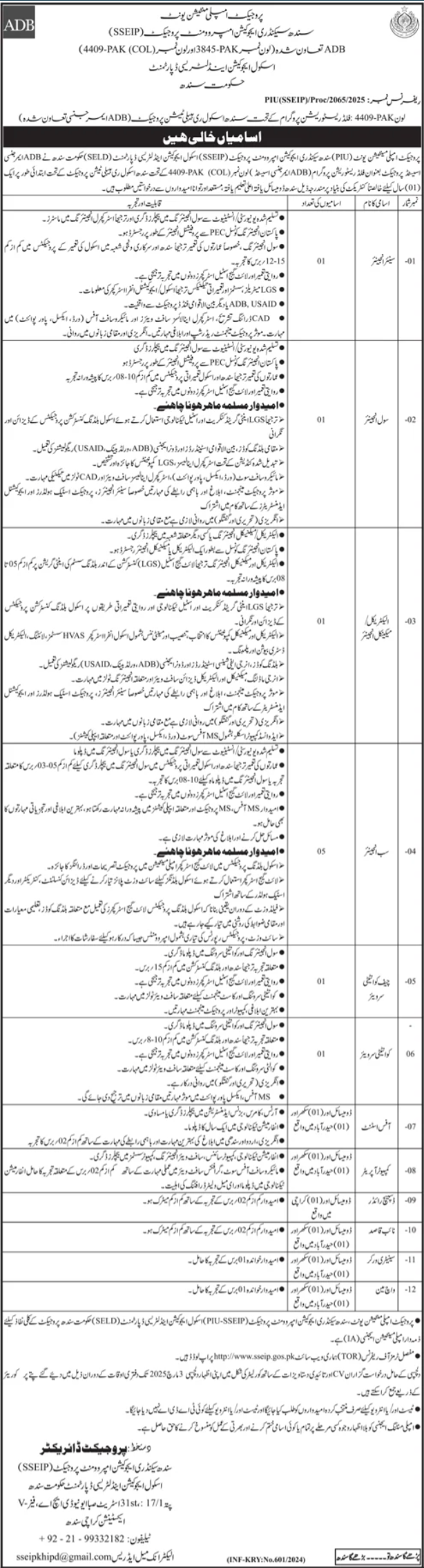 The Sindh School Education & Literacy Department (SSEIP) is offering multiple job vacancies under the Sindh Secondary Education Improvement Project (SSEIP) in collaboration with the Asian Development Bank (ADB). These positions are available in engineering, technical, and managerial roles to support educational infrastructure in Sindh.