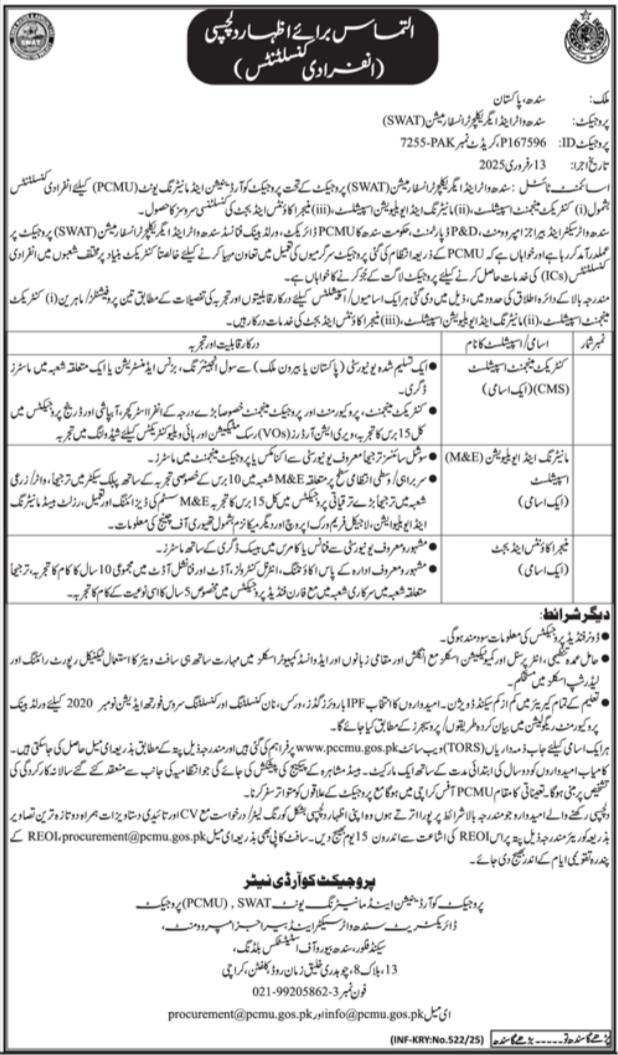 Sindh Water and Agriculture Transformation Project (SWAT) is seeking qualified professionals for various consultant positions. The hiring will be on a contractual basis under the Project Coordination and Monitoring Unit (PCMU) of the Planning & Development Board, Government of Sindh. The purpose is to support project implementation through technical, monitoring, and advisory roles.